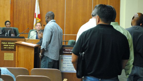 Delray Beach residents and contractors hired to build the Villages of Delray housing project tell their stories to the Delray Beach City Commission Tuesday evening. In the background are commissioners Angeleta Gray and Adam Frankel.