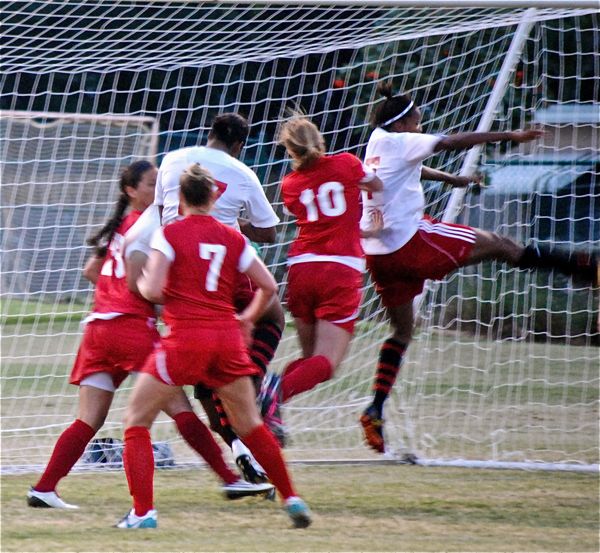 Tampa Hellenic, in the white jerseys tries to score on a corner kick earlier in the second half against Palm Beach United Friday evening. Tampa failed this time but scored the game winner off a corner kick later in the game.